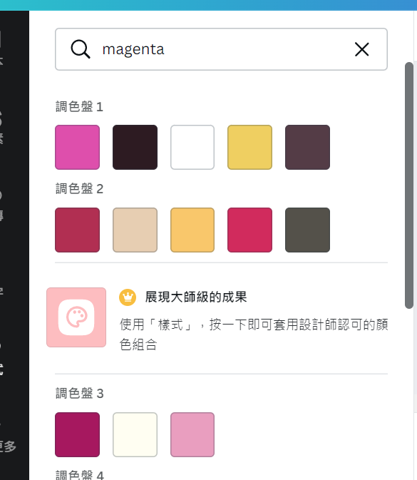 「樣式」,選「調色盤」,按一下,像轉盤一樣,可選另一種顏色。