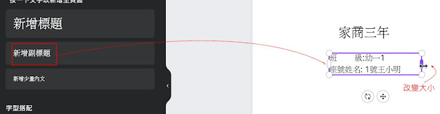 文字/新增副標題。輸入 「班 級:幼一1 座號姓名: 1號王小明」。