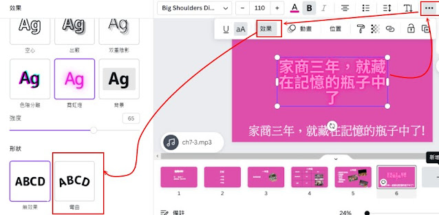 選「家商三年」,按「...」(顯示更多),選「效果」,選「霓虹燈」。