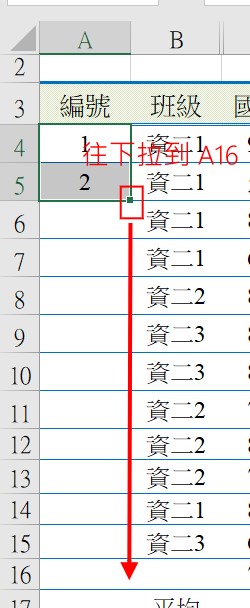 A4 輸入1,A5 輸入2,選A4:A5 , 直接將右下方的填滿控點向下拉曳到 A16。