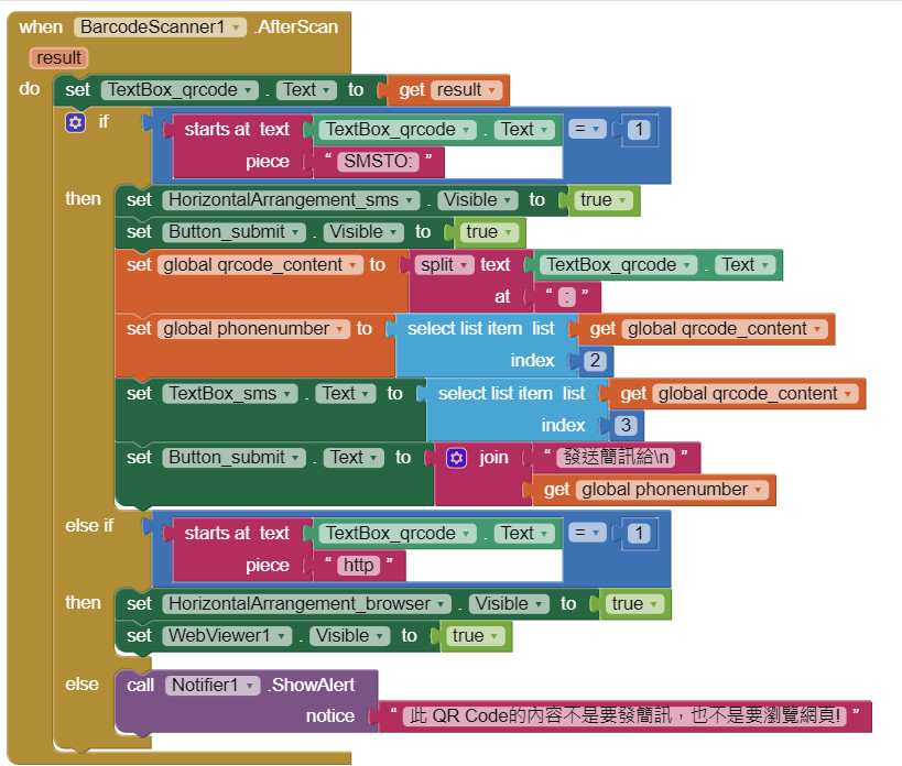 QR Code的內容是網址,使用 AppInventor2 的瀏覽器來瀏覽。