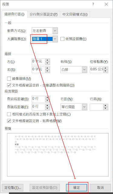 大綱階層改成 「階層1」,按「確定」鈕,再按一次「確定」鈕。